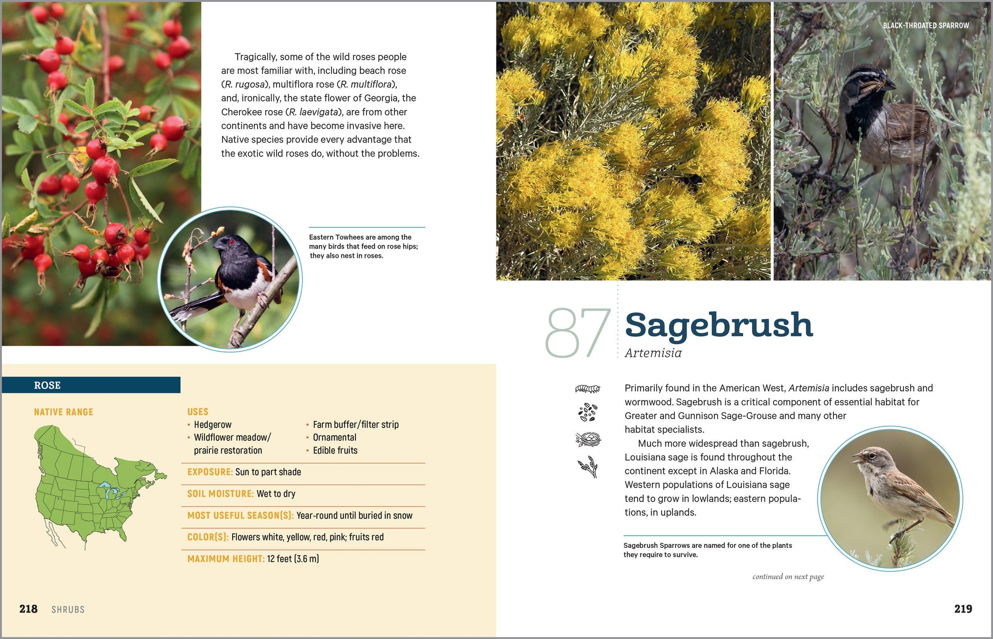 This guide offers in-depth planting and care information for 100 native plant species that feed and shelter birds all year long, including during breeding and migrating periods. Some of these plants can be added to your garden, some are helpful wild plants to avoid weeding, and some are trees that you can plant.