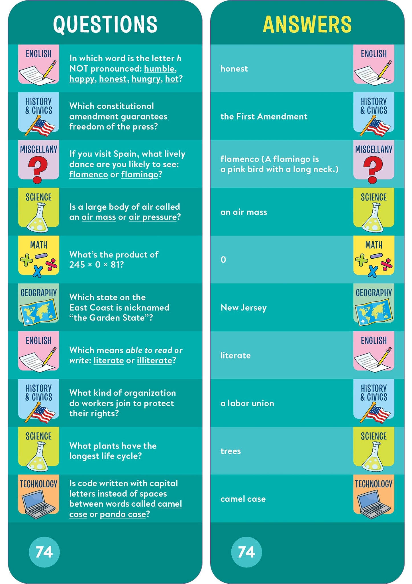 Brain Quest 5th Grade Smart Cards helps kids aged 10 – 11 to learn core classroom subjects in a smart, entertaining, and engaging way. It’s Q&A fun that fifth graders can use to test their knowledge. Smart cards feature hundreds of questions with answers to help kids know exactly what they need to know, when they need to know it.