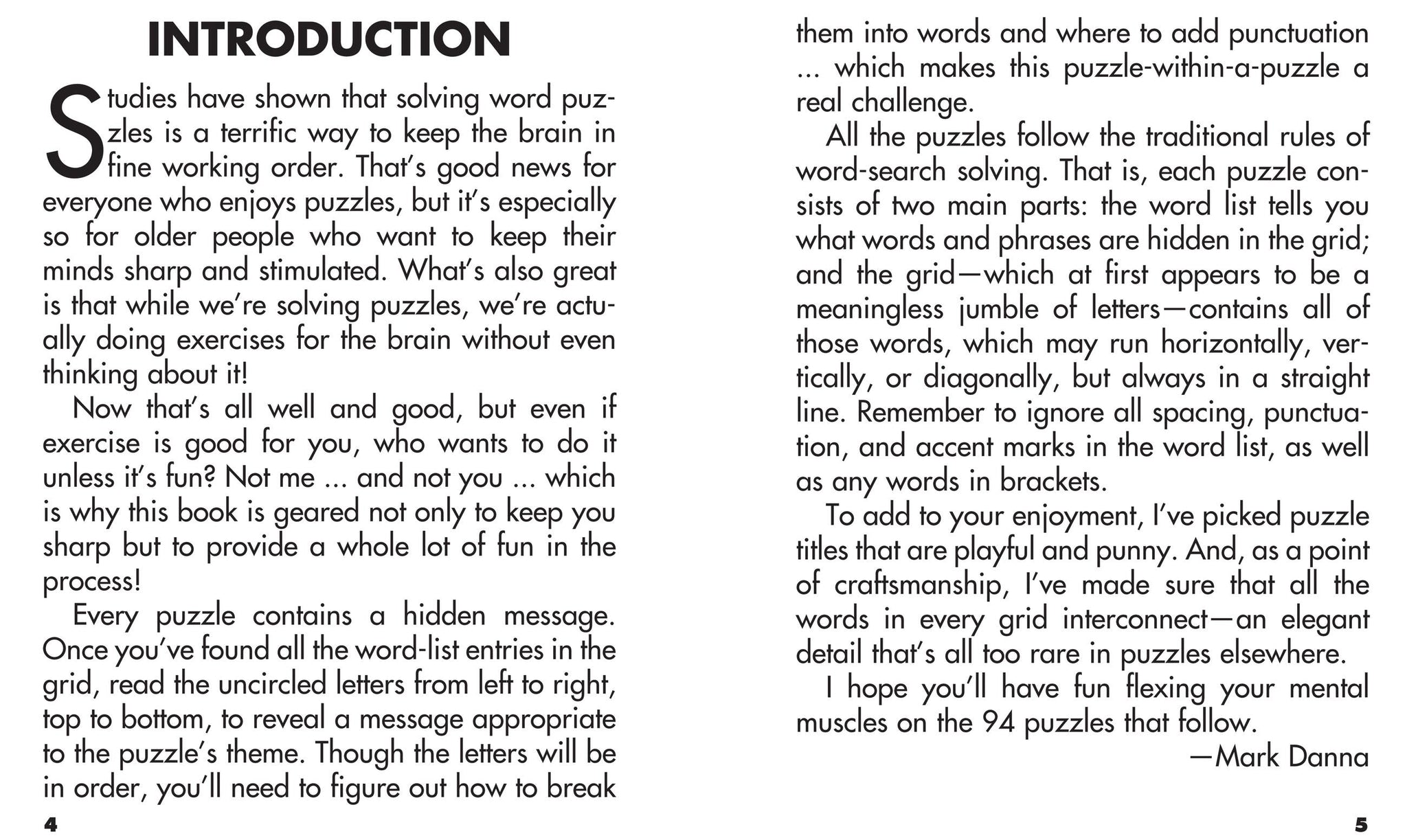 Solving word search puzzles should tax your mind, not your eyes. Luckily, puzzlesmith Mark Danna has provided plenty of word search challenges with large type for your enjoyment. The letters in the grid are large, and so are the letters in the word lists, so if you still can't find a word, it won't be because you couldn't read it. Get Large Print Word Search Puzzles 2--and see what you've been missing.