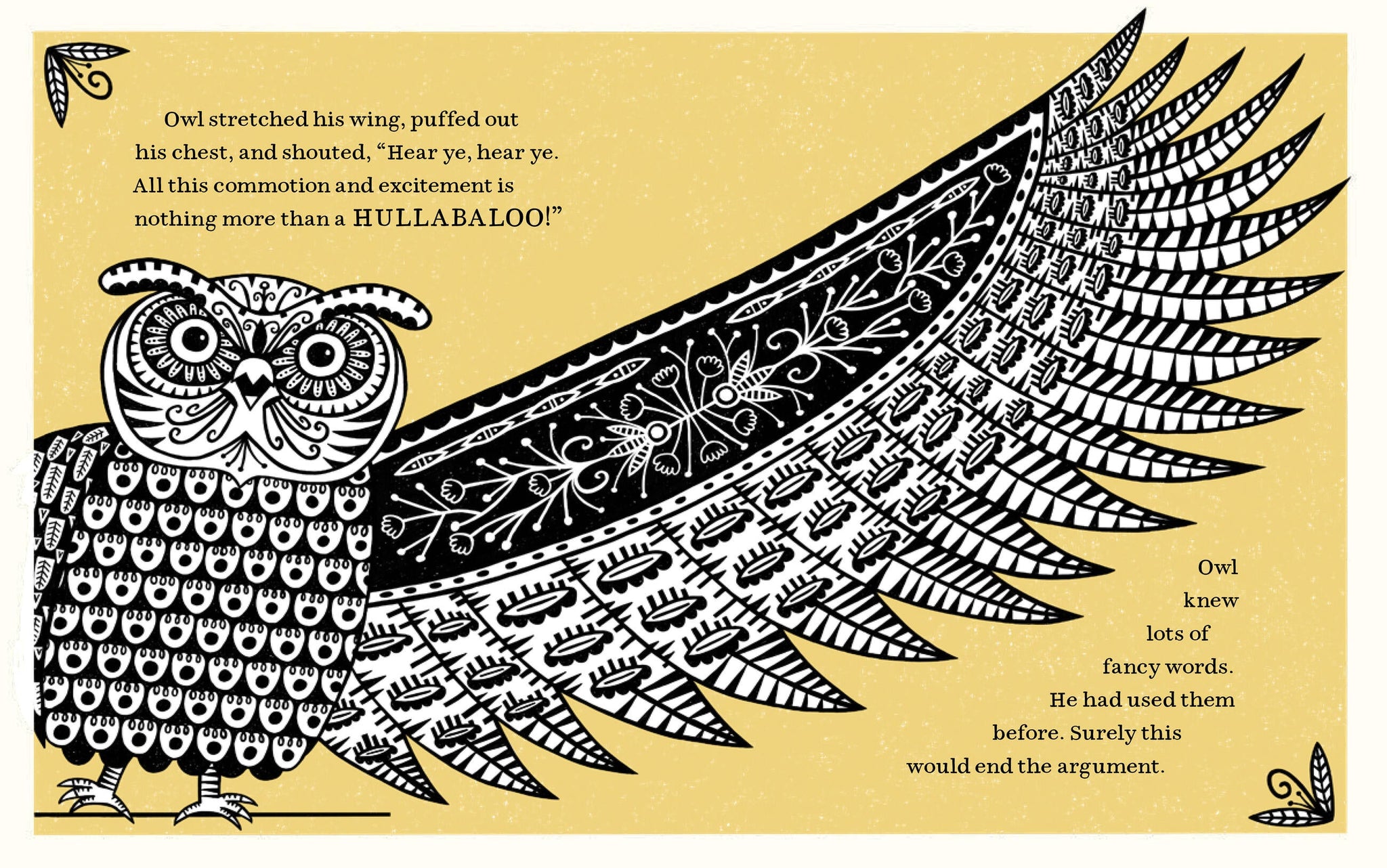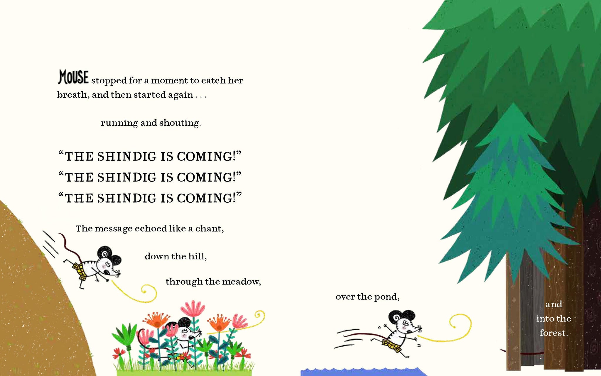 After receiving an urgent mountaintop message from the blue jay, Mouse proclaims to all the woodland creatures: “The Shindig is coming!” The entire forest is soon abuzz with everyone asking the same question: What is a shindig? Meetings are held. Assumptions are made. Honey cake is served. Finally Bear declares the answer. A shindig is a party, which is just like a meeting only fun. Problem solved! . . . Or is it?